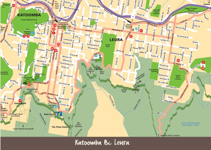 Le prix est entre 39 $ et 43 $ par personne pour l’utilisation de toutes les attractions. Vous pouvez aussi choisir le Scenic Cableway et le Scenic Walkway. Tout est mis en place pour profiter de votre visite avec des bus disponibles depuis Katoomba (prenez le bus Blue Mountains Explorer ou le bus Trolley Tours, et arrêtez-vous au bâtiment principal de Scenic World) et un parking gratuit couvert. Nous avons adoré Voici une carte de Katoomba: