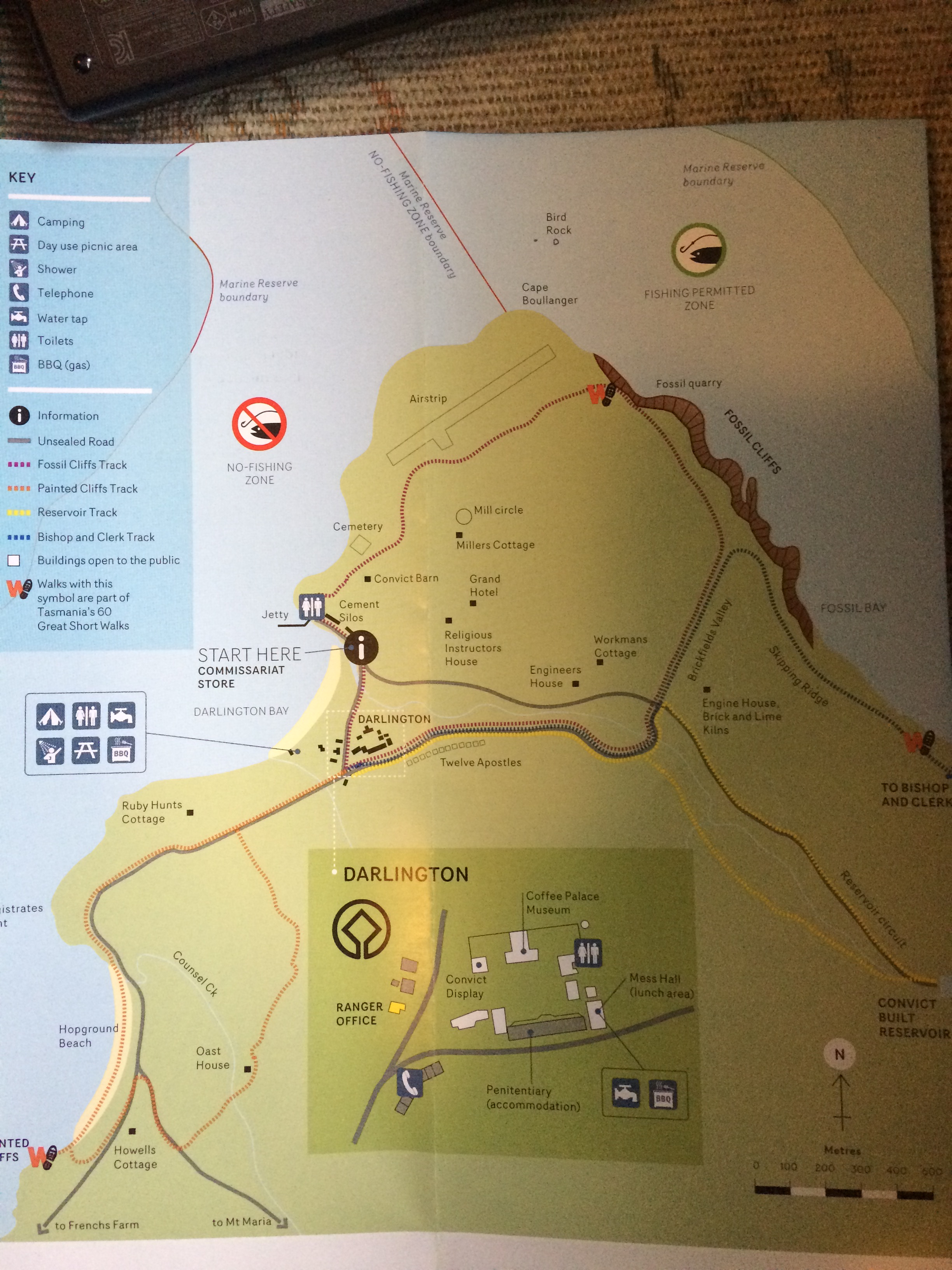 Nous voilà en admiration avec la plage de sable blanc et l’eau si claire qu’on peut en voir le fond à partir de la jetée. La jolie maison sur la droite de la jetée est en fait le Visitor Centre, c’est là qu’il faut s’arrêter pour réserver notre emplacement de tente. Il y a aussi plein d’infos sur Maria Island et son histoire. Ils nous ont fait un prix de groupe, bien qu’on soit 3 tentes et 4 personnes, à $13 par nuit. Coût du logement total $39 pour 4 personnes les 3 nuits. Qui dit mieux?