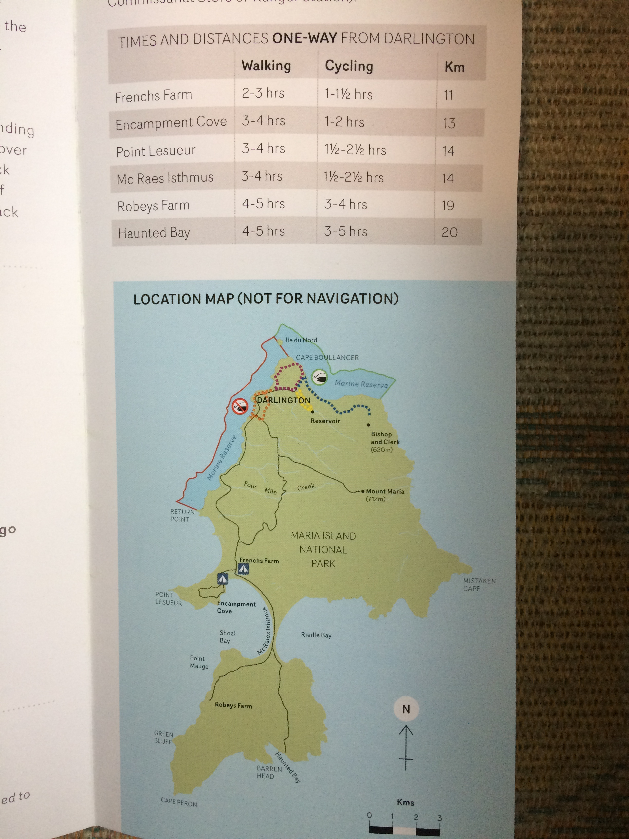 - Il y a aussi 2 autres campements disponibles sur Maria Island mais seulement accessibles à pied (3 heures) ou à vélo (1 heure), situés plus au Sud, French’s Farm et Encampment Cove. Ces campements sont gratuits et ont des toilettes disponibles.