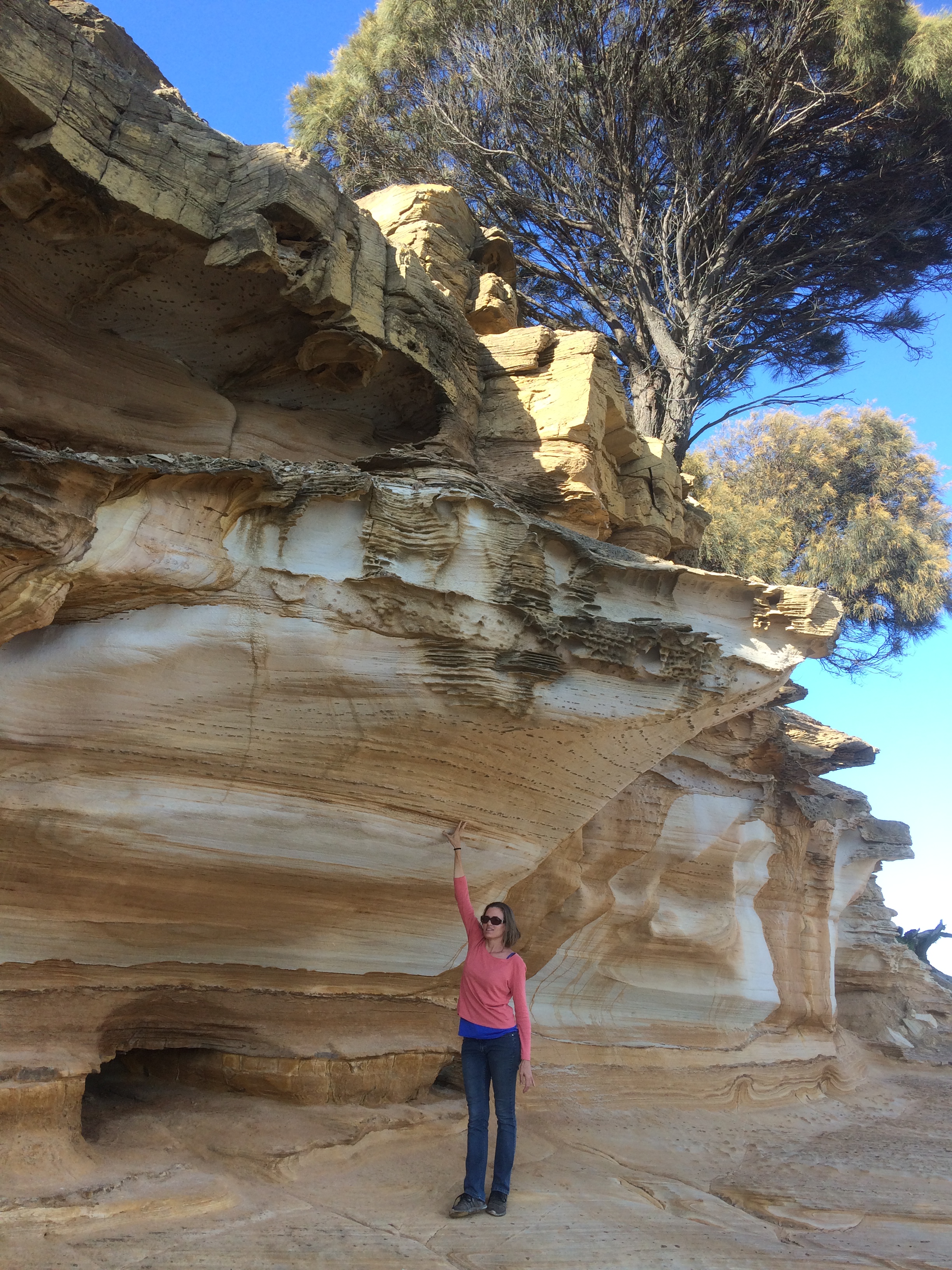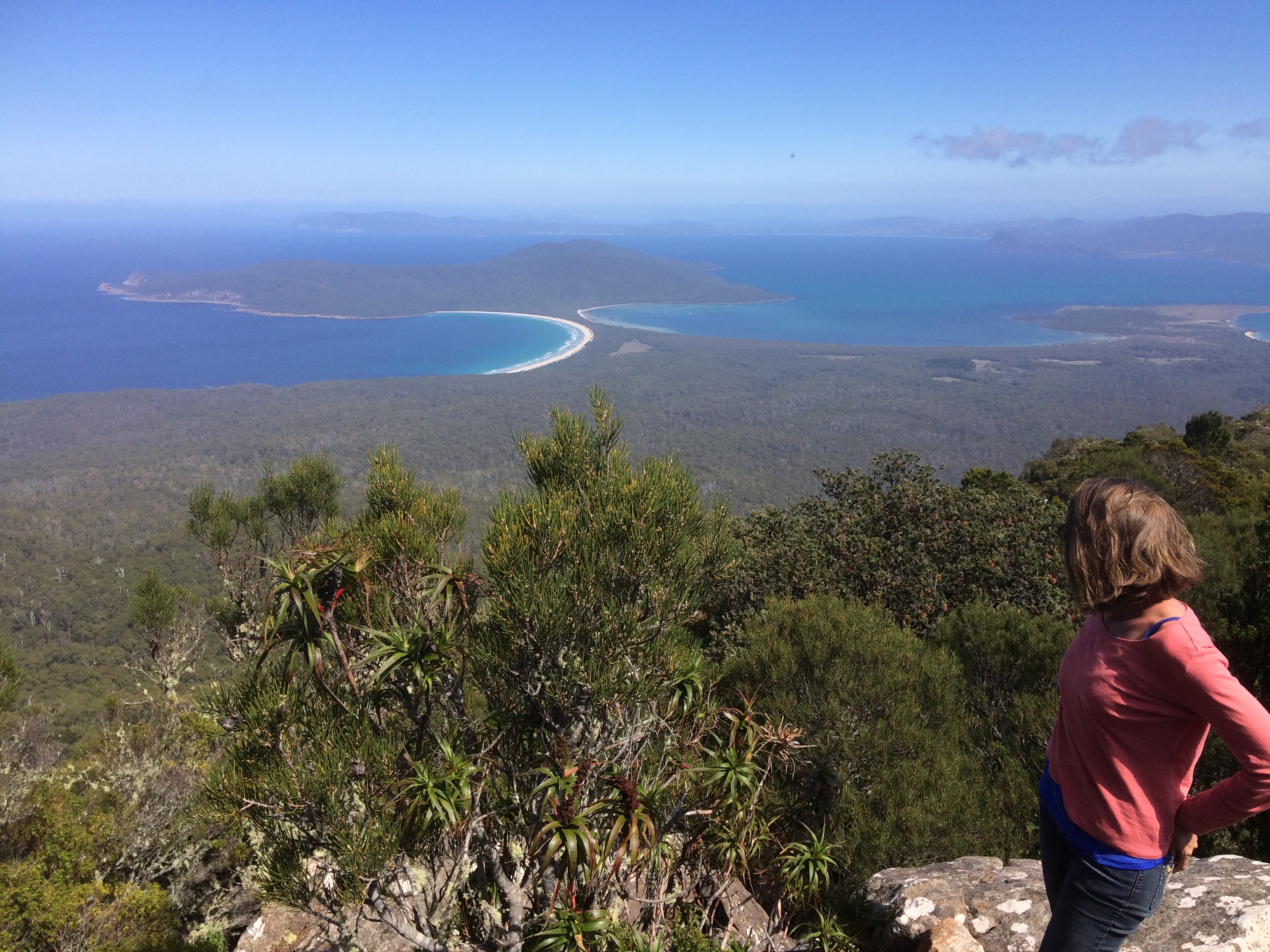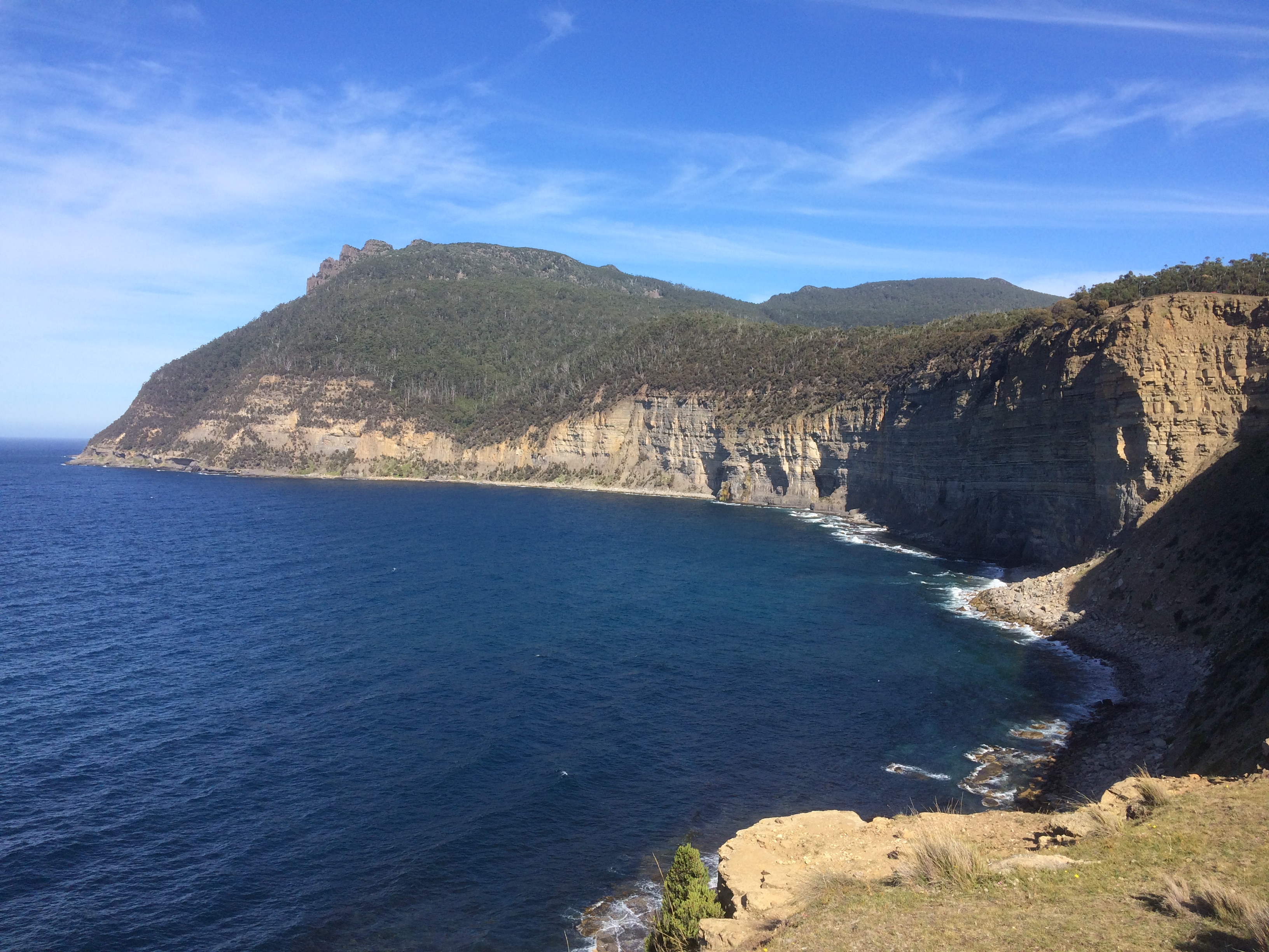 Le jour suivant, on est parti pour une journée rando en commencant par la visite de Painted Cliffs (accessible 2 heures au moins après la marée haute sinon l’eau recouvre le chemin). Ces roches faites de grès sont d’une couleur orangée et ressemble à des vague. Très joli! Puis on continue à marcher pour atteindre le début du sentier qui mène à Mount Maria. Le sentier est assez facile jusqu’au moment où il faut marcher sur les rochers puis presque escalader les rochers! Attention, prévoyez de bonnes chaussures! Une fois arrivé en haut, le point de vue sur l’île et au-delà est sublime si le temps n’est pas brumeux bien sûr. Sur le chemin du retour on passe un moment a la plage avant le coucher du soleil et on fait une courte baignade, même si l’eau est très fraiche (c’est bon pour les courbatures, non?). Le soir on essaye de trouver les diables de Tasmanie mais sans succès!